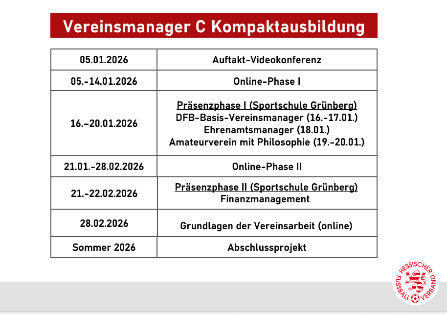 Los geht es bereits am 05.01.2026 mit der Auftakt-Videokonferenz. Die erste fünftägige Präsenzphase vom 16. – 20.01.2026 umfasst den DFB-Basis-Vereinsmanager, den Ehrenamtsmanager sowie das Modul Amateurverein mit Philosophie. In der zweiten Präsenzphase am 21. und 22.02.2026 wartet das Vertiefungsmodul Finanzmanagement auf die Teilnehmenden. Die Ausbildung schließt mit der Ausarbeitung und Präsentation des Abschlussprojektes ab.
