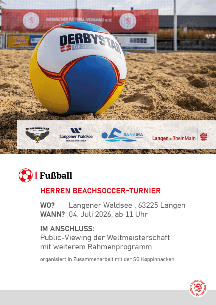 Am Samstag, den 4. Juli 2026 findet nach einer zweijährigen Wartezeit wieder ein Beachsoccer-Turnier in Hessen statt. Hierzu hat sich der HFV mit den zweimaligen Siegern der deutschen Meisterschaft SG Køppinnacken zusammengetan und richten das Turnier zusammen am Langener Waldsee aus.