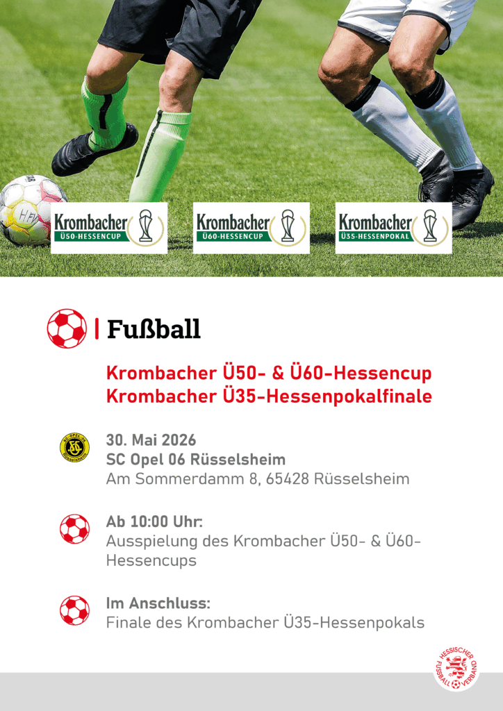 Das Finale des diesjährigen Krombacher-Ü35-Hessenpokals findet im Rahmen der Ü-Cups bei Opel Rüsselsheim, am 30. Mai 2026 statt. Eine Uhrzeit wird so früh wie möglich bekannt gegeben.