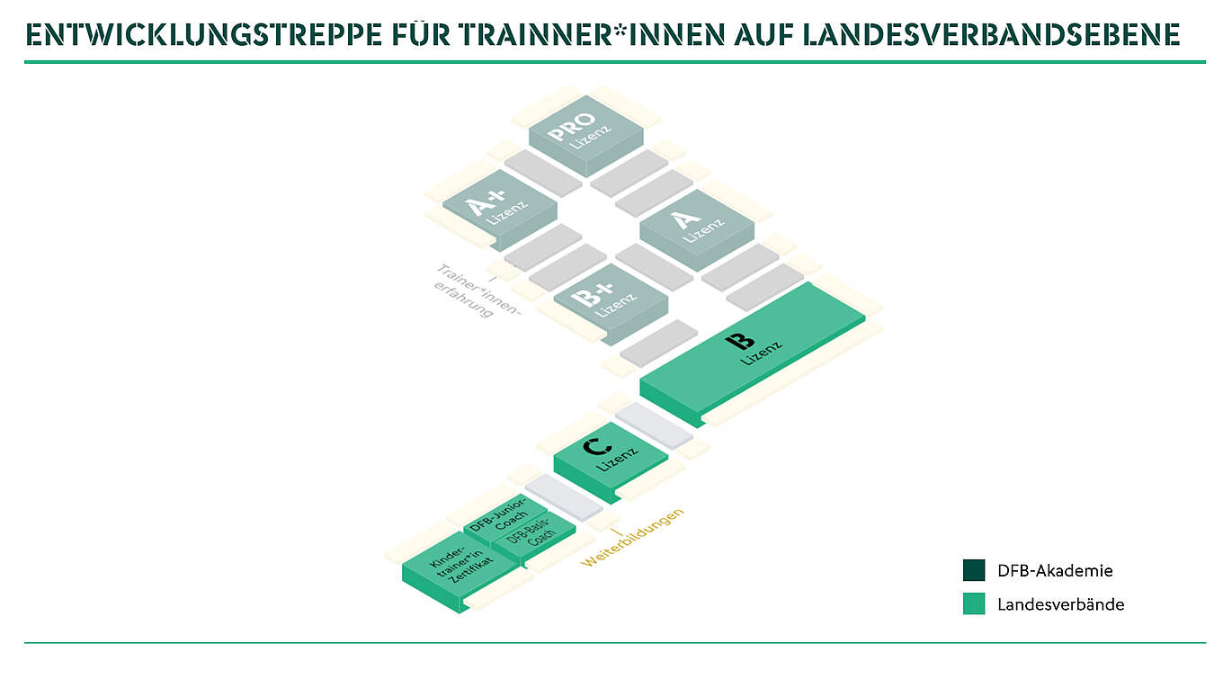 Im Sommer 2022 hat das DFB-Präsidium umfangreiche Änderungen in der Ausbildung von Trainer*innen und Vereinsmanager*innen im Amateurfußball verabschiedet. Mit diesem Schritt wurde die Reform hin zu einer neuen Entwicklungstreppe und einem einheitlichen Bildungsverständnis in der Qualifizierungsarbeit des DFB abgeschlossen.
