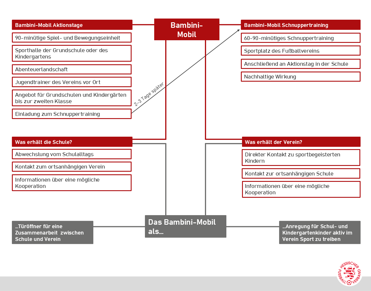 Zusammengefasst bietet das Bambini-Mobil einerseits die Möglichkeit für Grundschulen oder Kindergärten von einer Kooperation mit dem örtlichen Fußballverein zu profitieren, andererseits die Möglichkeit für den Verein Kinder für die eigene Jugendarbeit zu gewinnen.