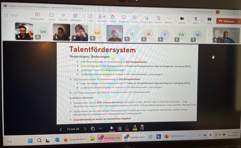 Bereits zum vierten Mal fand am 16.09.2025 eine digitale Sprechstunde für hessische Auswahlspielerinnen und deren Eltern statt, um eine Plattform zum Austausch und zur Informationsweitergabe für junge Talente zu ermöglichen. Der Verbandsausschuss für Frauen- und Mädchenfußball hat die Idee entwickelt, die erneut mit großer Resonanz angenommen wurde – knapp 80 Spielerinnen und Eltern nahmen an […]