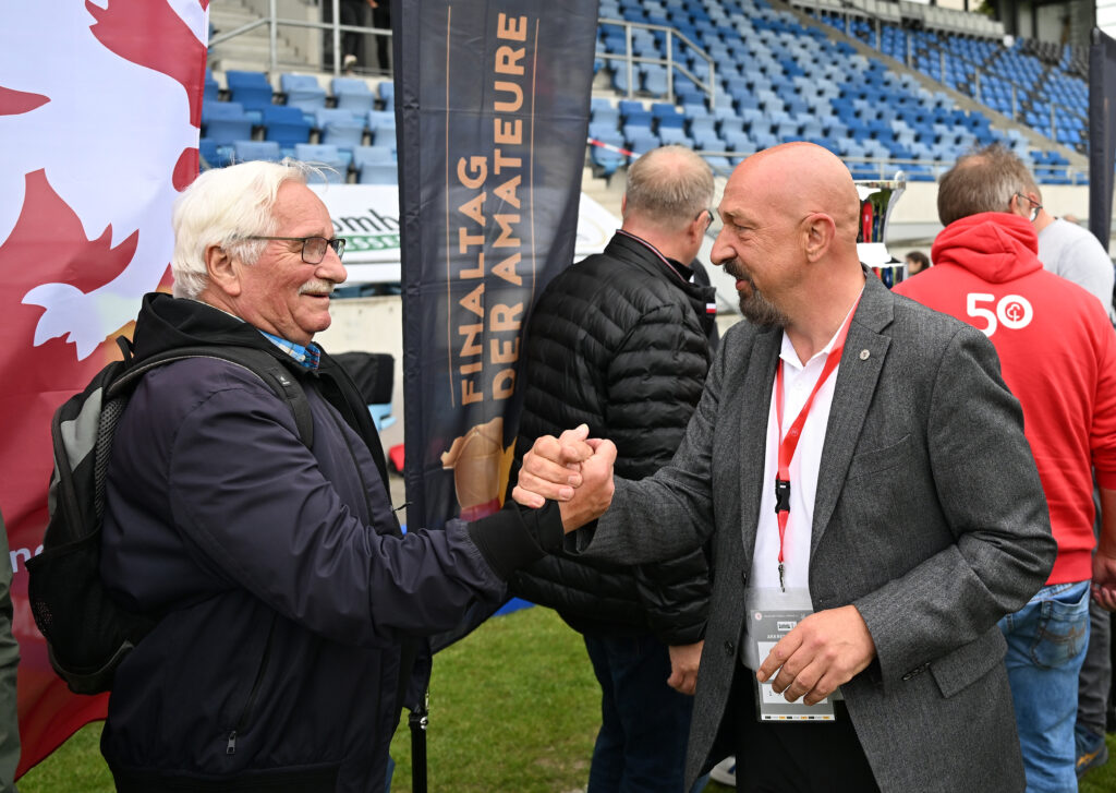 Der sportliche Höhepunkt wartete am Nachmittag in Frankfurt: Gemeinsam besuchte die Gruppe das Krombacher-Hessenpokalfinale in der PSD Bank Arena. Dort begrüßten die HFV-Vizepräsidenten Dr. Axel Poth und Sascha Schnobrich die Preisträger*innen und dankten ihnen für ihre unbezahlbare Arbeit in den hessischen Vereinen. Ein Erinnerungsfoto mit dem Hessenpokal auf dem Spielfeld durfte im Anschluss natürlich nicht fehlen. In packender Atmosphäre verfolgte man das spannende Finale zwischen dem SV Wehen Wiesbaden und dem KSV Hessen Kassel, das erst im Elfmeterschießen zugunsten der Wiesbadener entschieden wurde.