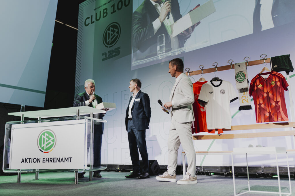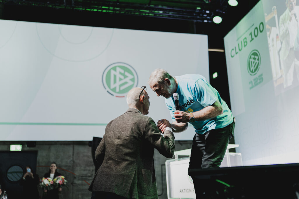 Viel wichtiger war es aber noch, dass die Geehrten ihre Geschichten erzählen konnten. Nachdem zunächst vor allem über sie gesprochen wurde, kamen dann auch die Preisträger*innen selbst zu Wort. Stellvertretend für die 125 Mitglieder des diesjährigen Club 100 berichtete unter anderem das hessische Club 100 Mitglied Reiner Schwaier von der FSG Riedrode. Der Schiedsrichter aus dem Kreis Bergstraße ist seit 40 Jahren an der Pfeife aktiv und hat daneben auch eine Walking-Football-Gruppe im Verein gegründet. Geschichten wie diese gibt es in 125-facher Ausführung zu hören. Alle Facetten der ehrenamtlichen Arbeit in und um den Fußball waren in Dortmund vertreten.