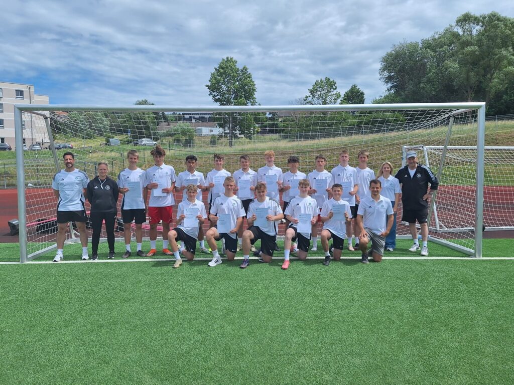 Nach insgesamt 40 Lerneinheiten, die an vier Tagen absolviert und in theoretische sowie praktische Inhalte aufgeteilt waren, erhielten 17 Teilnehmer*innen das Zertifikat zum DFB-Junior-Coach. Ins leben gerufen wurde der Lehrgang durch Nina Fabienne Schmitt und Nils Krautwald, stellvertretender Schulleiter der Holderbergschule Eibelshausen. Neben der Vermittlung von sportspezifischem Wissen wird vor allem Wert auf die Persönlichkeitsentwicklung der Teilnehmer*innen gelegt. Geleitet wurde der Kurs von HFV-Lehrrferent Karl-Otto Mank und von Nina Fabienne Schmitt, die bereits eine Fußball AG für Mädchen an der Holderbergschule leitet. Pädagogische Unterstützung wurde durch die Sportlehrkräfte Laura Erner, Julian Heinz und Nils Krautwald geleistet.