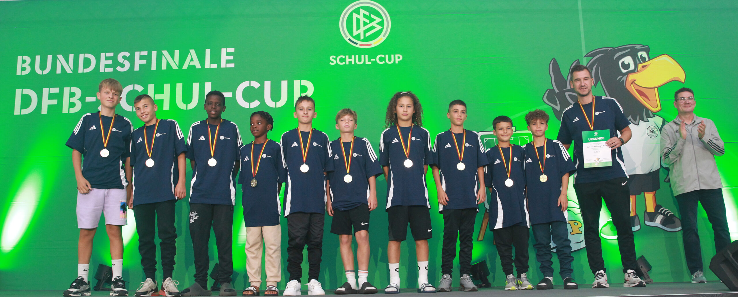 Die Jungen der Carl-von-Weinberg-Schule Frankfurt konnten mit 4:3 gegen Nordrhein-Westfalen gewinnen und sich damit den fünften Platz sichern. Die Mädchen der Elly-Heuss-Schule schafften darüber hinaus die Sensation und gewannen das Endspiel gegen Niedersachsen mit 2:1 und krönten sich damit zum Bundessieger des DFB-Schul-Cups 2024.
