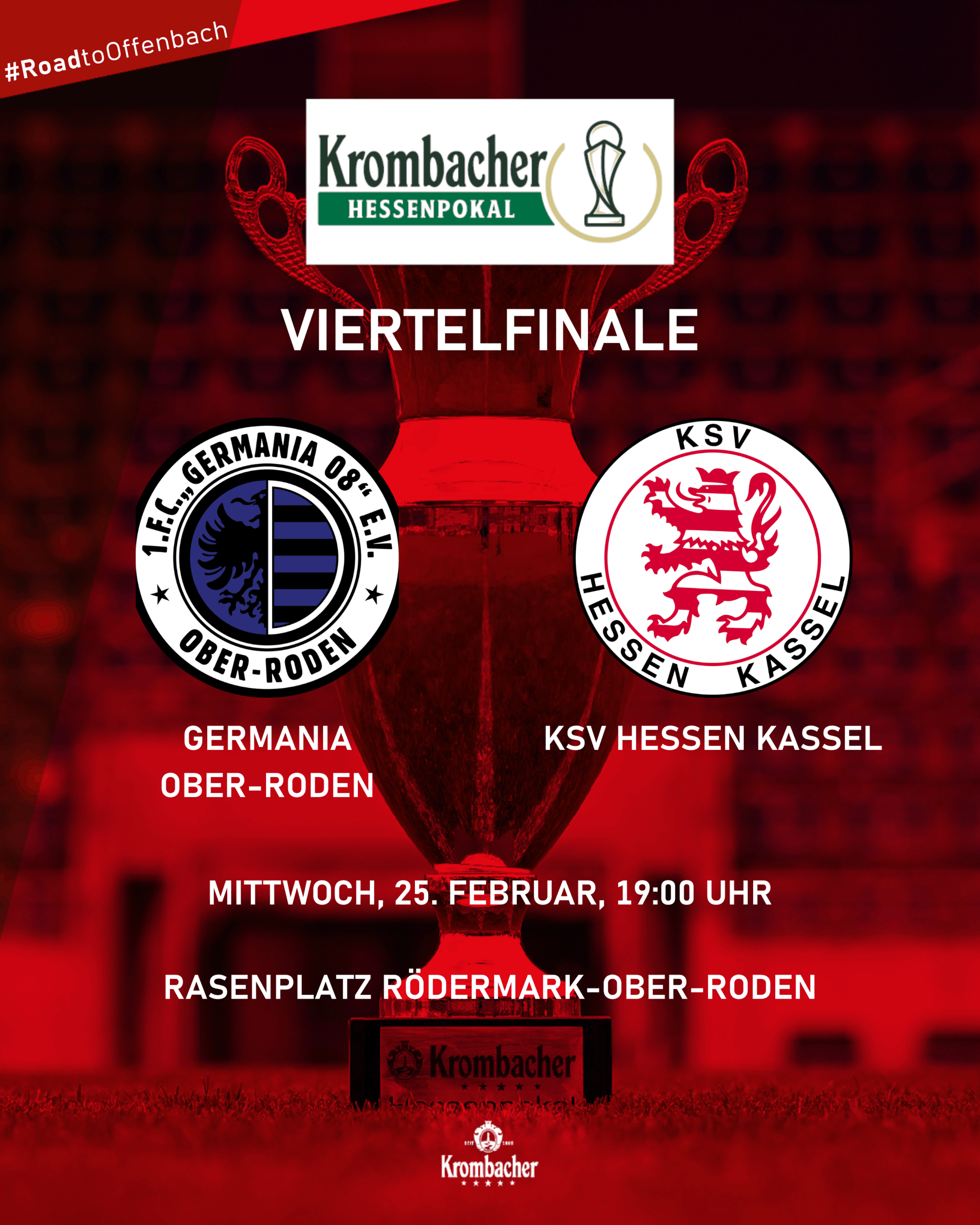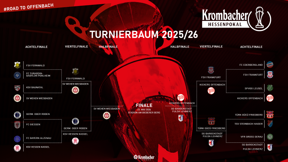 Drei der Halbfinalisten stehen nach spannenden Viertelfinalpartien im hessischen Pokalwettbewerb bereits fest. In allen drei Begegnungen setzten sich am Ende die Gäste (Kickers Offenbach, SG Barockstadt Fulda-Lehnerz & SV Wehen Wiesbaden) im Elfmeterschießen durch. Nun darf heute Abend auch Verbandsligist Germania Ober-Roden den nordhessischen Traditionsverein aus Kassel herausfordern. Der Sieger dieser Begegnung darf den aktuellen Titelträger und Drittligisten SV Wehen Wiesbaden vor eigenem Publikum empfangen.