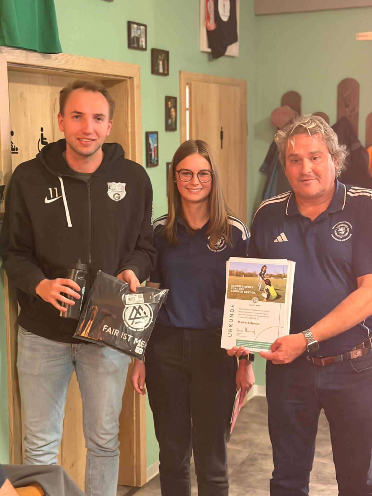 Der 24-Jährige erhielt vom DFB ein Handtuch sowie eine Trinkflasche. Zudem hatte Stefan Schindler für den Grebensteiner verschiedene Gutscheine parat. Die Meldung über diese faire Geste hatte Schiedsrichter Sven Werner beim Verband eingereicht.