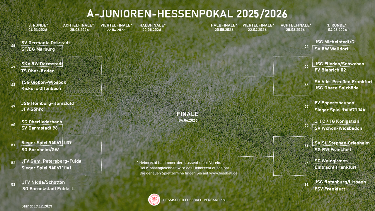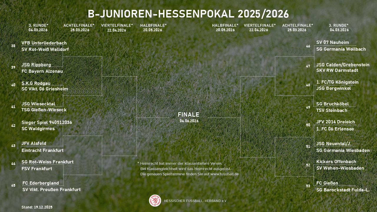 Die Hessenmeister der A- bis C-Junioren vertreten nun die hessischen Farben bei den Meisterschaften des Süddeutschen Fußball-Verbandes, die am 7. und 8. März 2026 in Ehningen (Württemberg) stattfinden. Dort treffen sie auf die besten Teams Süddeutschlands und kämpfen um weitere Erfolge auf überregionaler Ebene. Im besten Fall bei den Deutschen Futsal-Meisterschaften.